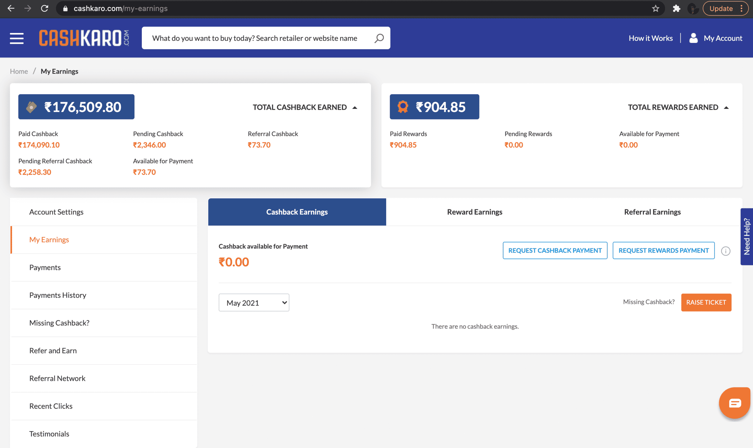 I have attached a screenshot of my earnings from Cashkaro from 2013 and the following earnings proof includes my earnings from shopping as well as referring people via my CashKaro referral code. So far I have earned a total of ₹176,509.80 as cashback and ₹904.85 as rewards.